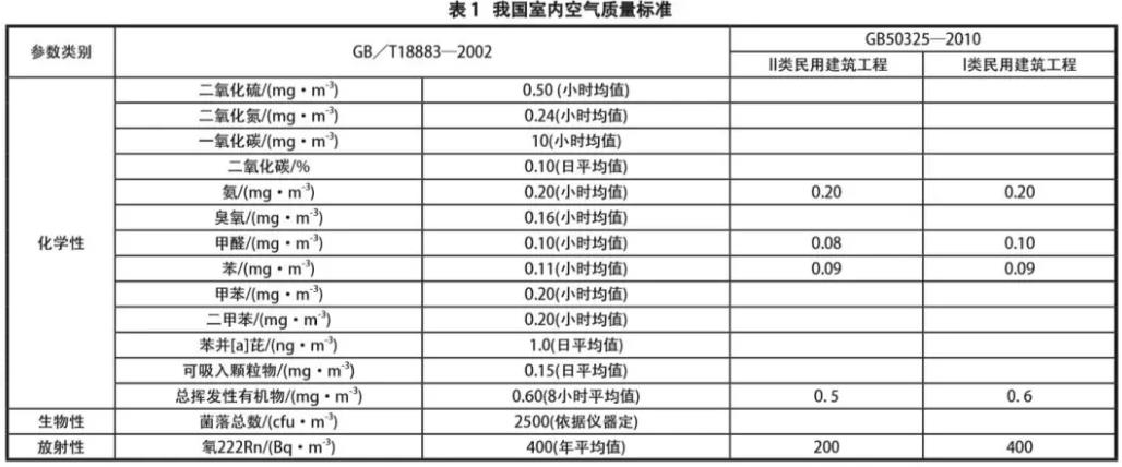 当前,世界各国根据各自国情建立了比较完善和具有借鉴意义的污染物标准,并泛称为IAQ(Acceptable Indoor Air Quality)。国外以美国的 ASHRAE 标准和英国的 CIBE 室内空气质量和通风标准为代表,国内以 GB/T188832002《室内空气质量标准》和 GB 503252010 《民用建筑工程室内环境污染控制规范》为代表都对室内空气污染物标准做了严格的规范。