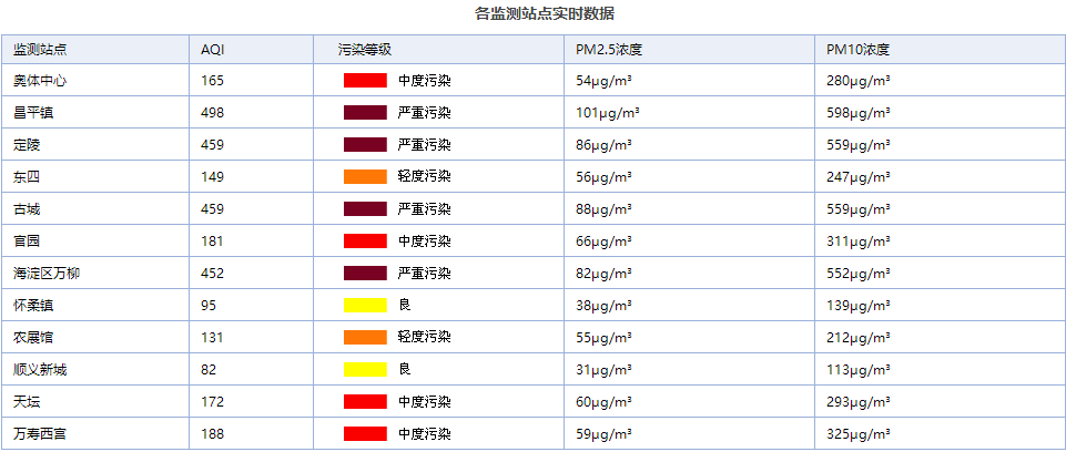 海淀、丰台、昌平、石景山、延庆、门头沟等区已陷入严重污染,首要污染物为PM10,市民外出请做好防护。